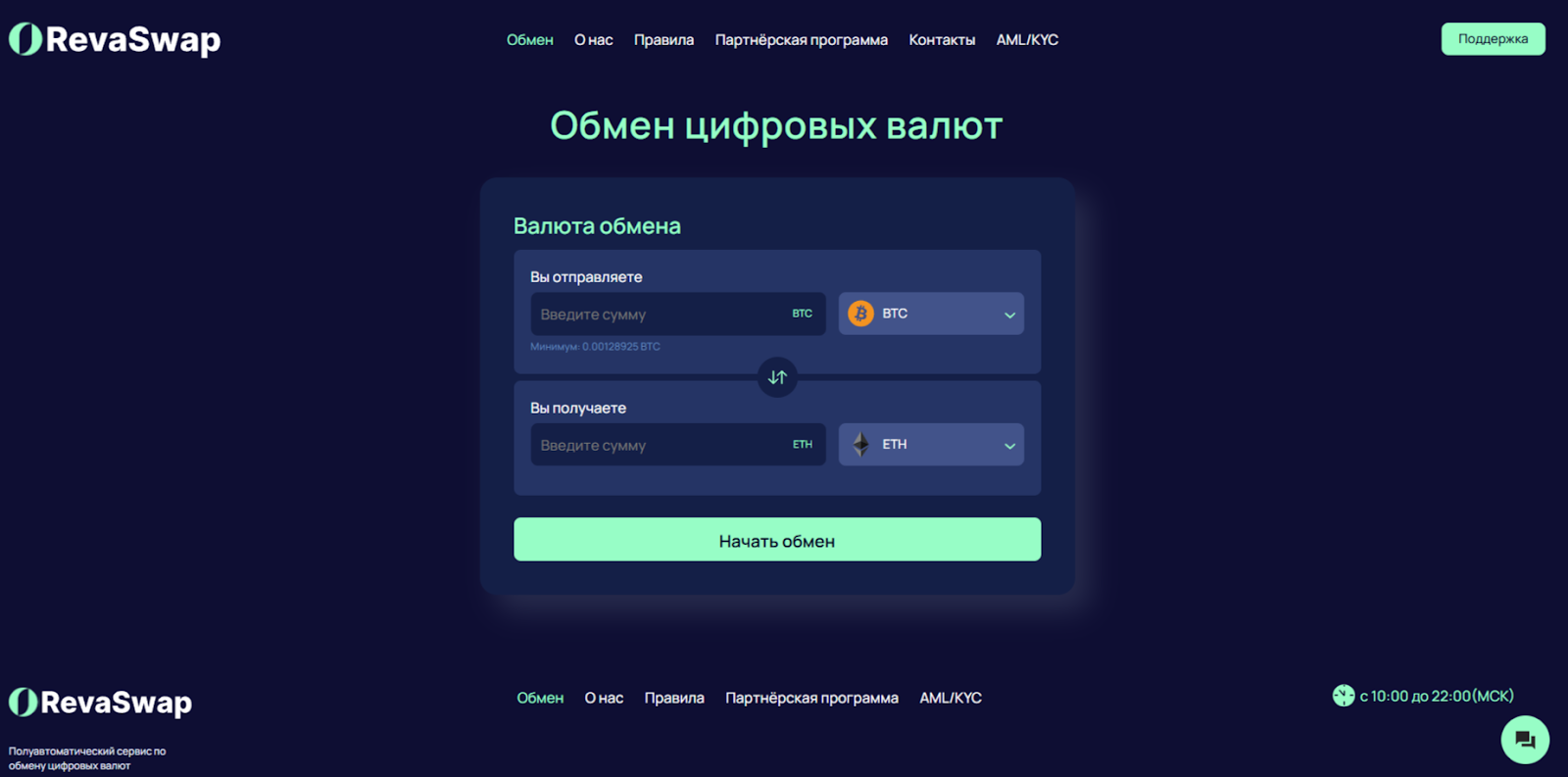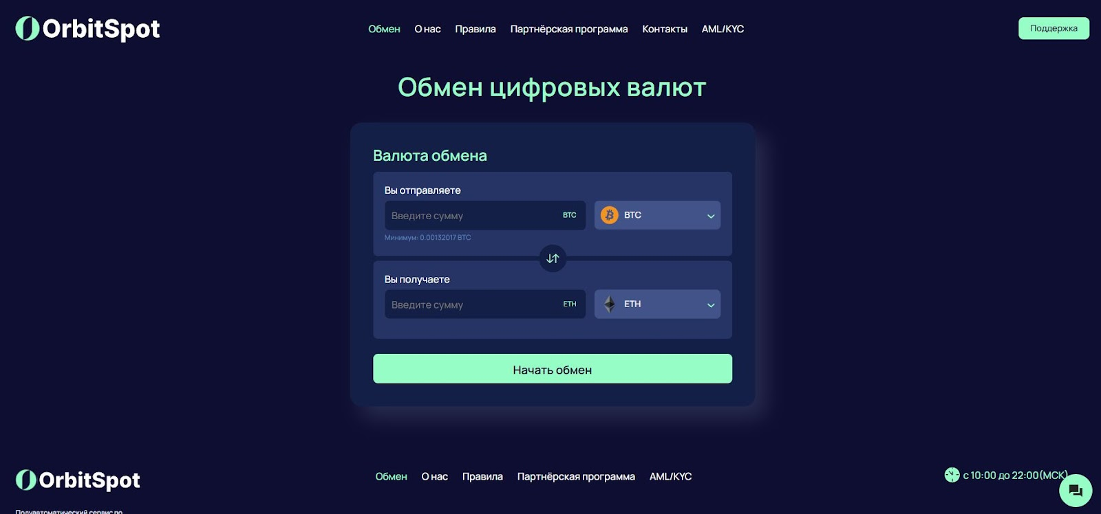 Оформление криптообменника идентично дизайну обменных пунктов OrbitSpot и RevaSwap. Упомянутые сервисы были замечены в мошеннических действиях. Шапка портала содержит вкладки «Обмен», «О нас», «Правила», «Партнерская программа», «Контакты», AML/KYC. Раздел «О нас» повествует о плюсах криптовалютного обменника. Рассказ о сервисе не содержит конкретных и официальных данных. Веб-сайт не предлагает пользователям ознакомиться со ссылками на лицензии и правовые документы. На ресурсе нет даже контактов организации.