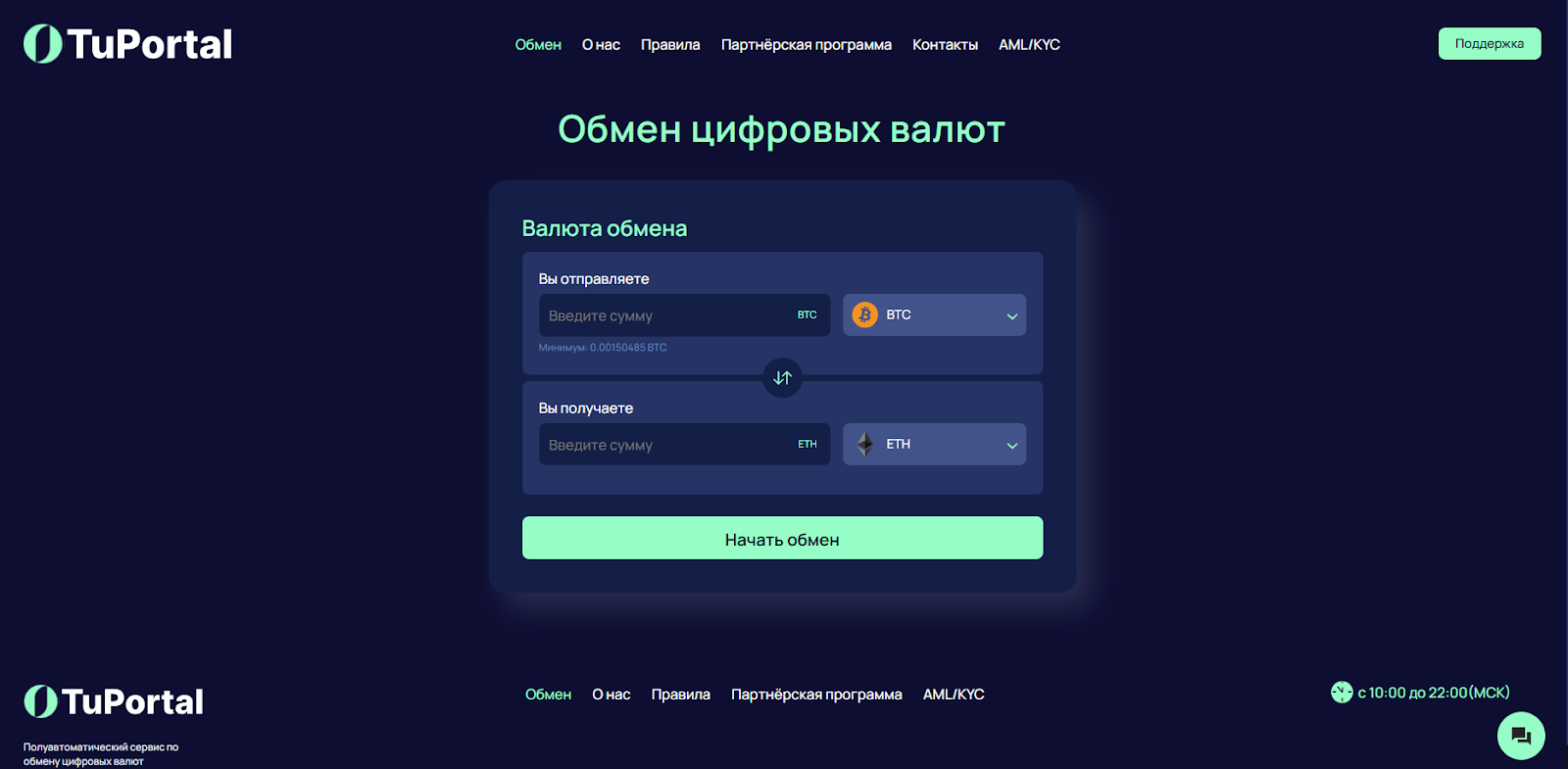 Обменный пункт TuPortal работает с пользователями каждый день, без перерывов и выходных. Время работы обменника с 10:00 до 22:00 МСК. В этом же режиме должна работать техническая поддержка сервиса в телеграм-канале tuportal org. Однако на момент обзора этот способ связи с саппортом отсутствует.
