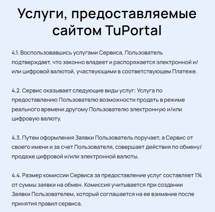 Тарифы обменника TuPortal идентичны ценам за обмен множества онлайн-сервисов. Данные о комиссионных сборах представлены в разделе «Правила». Пункт 4.4. упомянутых правил рассказывает об 1% комиссионного сбора от суммы заявки на обмен.