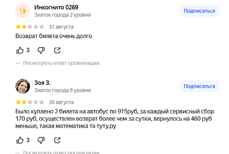Значительная часть жалоб касается возвратов денег. Сервис удерживает крупные суммы до 80% от стоимости билета под видом сборов комиссий РЖД или авиакомпаний. Деньги возвращают медленно, с отписками в поддержке и перекладыванием ответственности на перевозчика. Пользователи пишут о случаях, когда билеты продавали на отмененные рейсы без уведомления или с ошибками в данных.