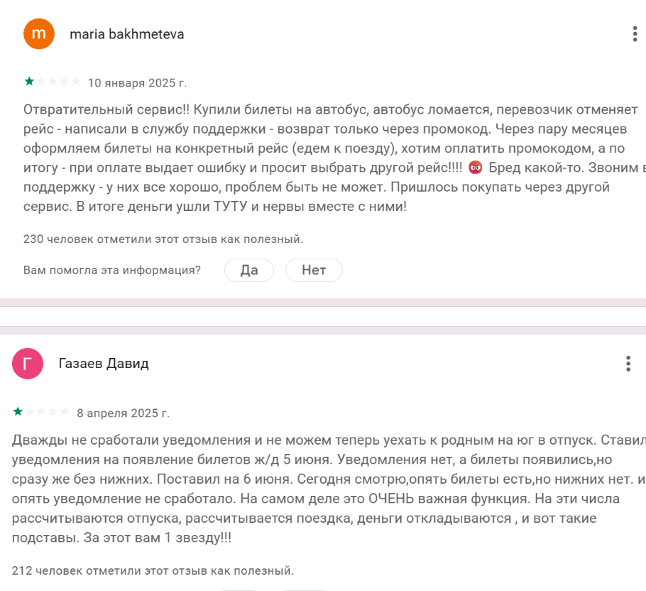 В интернете представлены негативные отзывы о проекте Tutu ru. Пользователи описывают опыт покупки билетов с последующими проблемами. Многие жалуются на завышенные цены по сравнению с продажами у перевозчиков РЖД и авиакомпаний.