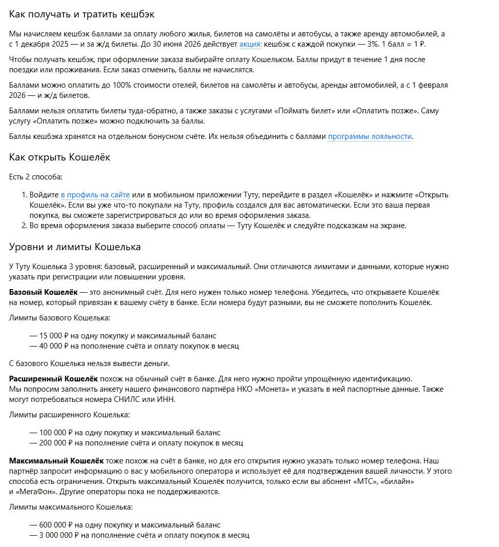 Услуги «Туту Кошелька» включают возможность оплаты билетов на самолеты и автобусы, бронирования отелей, а также аренды автомобилей напрямую с баланса счета. При этом за каждую такую оплату начисляется кешбэк в размере 3% баллами, где один балл равен одному рублю.