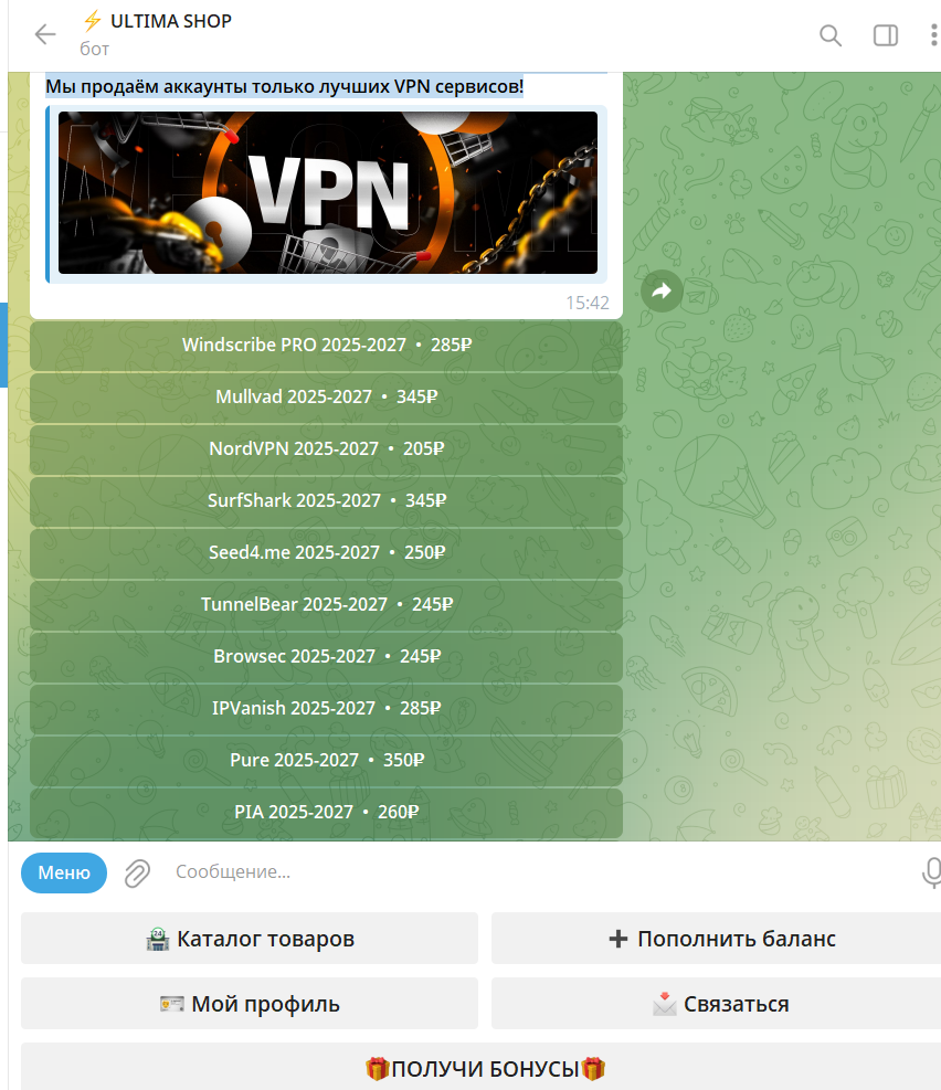 Те же VPN вроде NordVPN или SurfShark, которые здесь продают за 200-350 рублей на два года, в реальности чаще всего: либо взломанные, либо оплачены чужой картой. Поэтому такой аккаунт может просто перестать работать в любой момент — владелец сменил пароль, и все.