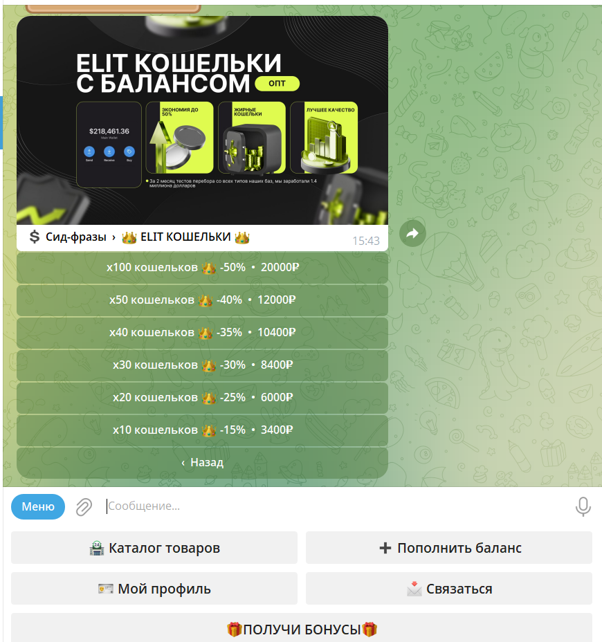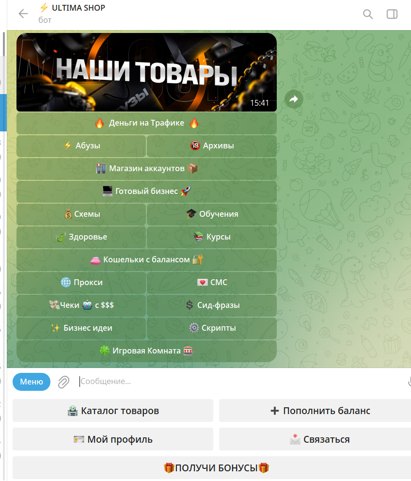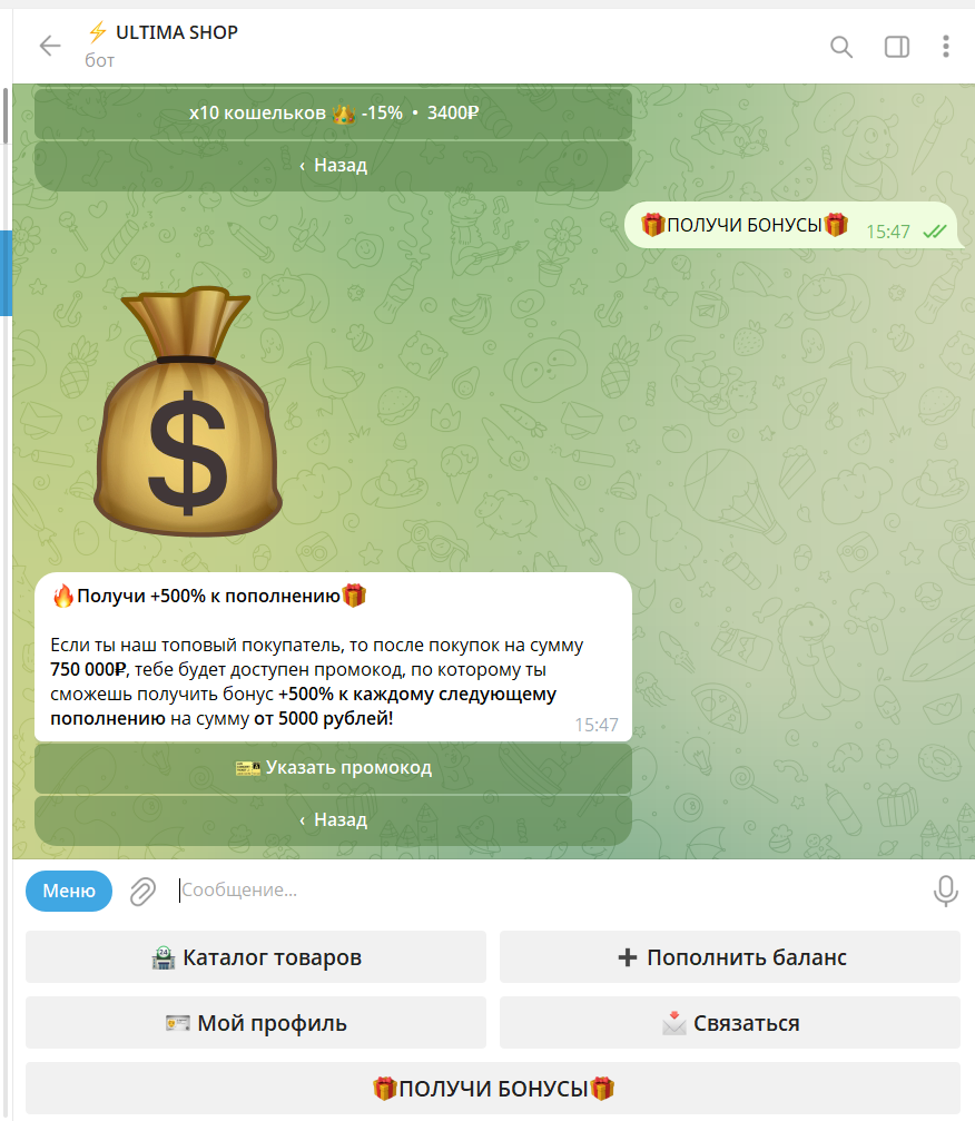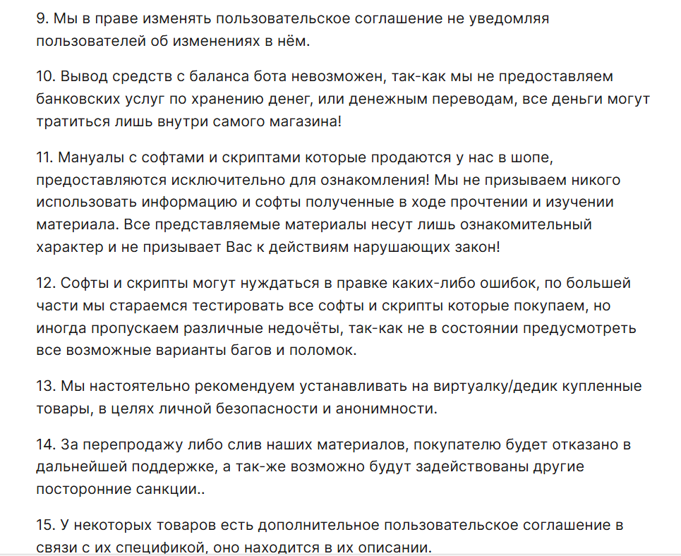 Поэтому категорически не советуем рассматривать данного бота как источник заработка или рабочие бизнес-решения. Использовать такой магазин можно только в рамках ознакомления, и только если вы изначально готовы к тому, что деньги не вернутся, а материалы окажутся бесполезными.