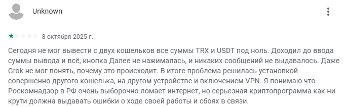 Один пользователь вообще не смог вывести TRX и USDT – кнопка продолжения операции просто не нажималась. Никаких ошибок не выдавалось. Решить проблему удалось только через другой кошелек с включенным VPN.