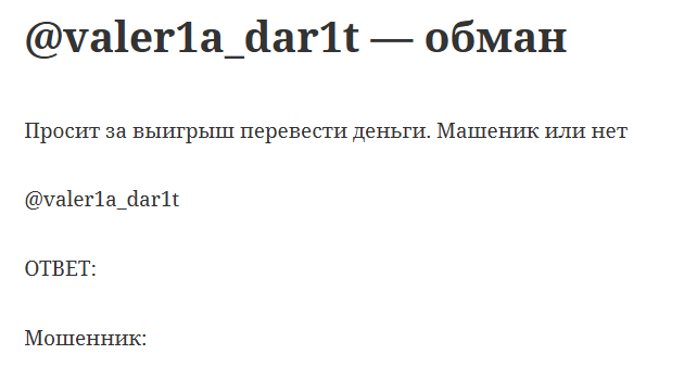 На деле любой, кто напишет Валерии, окажется одним из победителей. Но девушка не станет отдавать деньги первому встречному, да их у нее и нет. Развод заключается в следующем: пользователю сообщают, что он получит крупную сумму, но для начала нужно перевести Лере пару тысяч, так как банк включает систему Антифрод. Якобы встречная сумма позволяет снять ограничение на вывод, так как карту подписчика можно будет добавить в белый список. Это ложь, банковская система так не работает. Однако пользователи готовы пожертвовать небольшими деньгами в надежде получить главный приз. А дальше начинается череда платежей от налогов до комиссий, после которых подписчика блокируют.