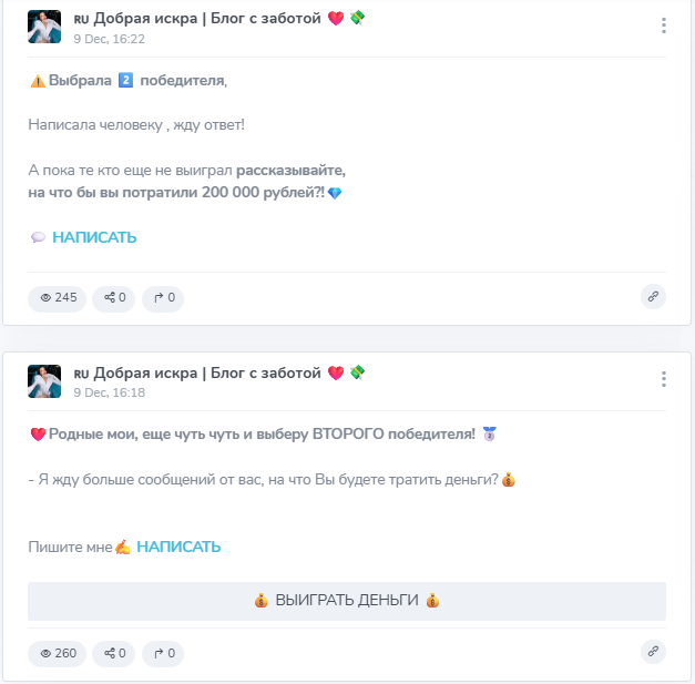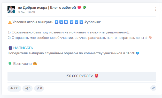Канал Добрая искра Блог с заботой — очередная раздача денег, которая сводится к разводу на деньги. Предлог для выкачки кошельков аудитории может быть любой, публика готова верить даже в абсурдные объяснения, когда речь идет о крупной сумме. Как иначе объяснить, что жертв обманывают легендами про антифрод и налог на выигрыш, проведенный неофициально?