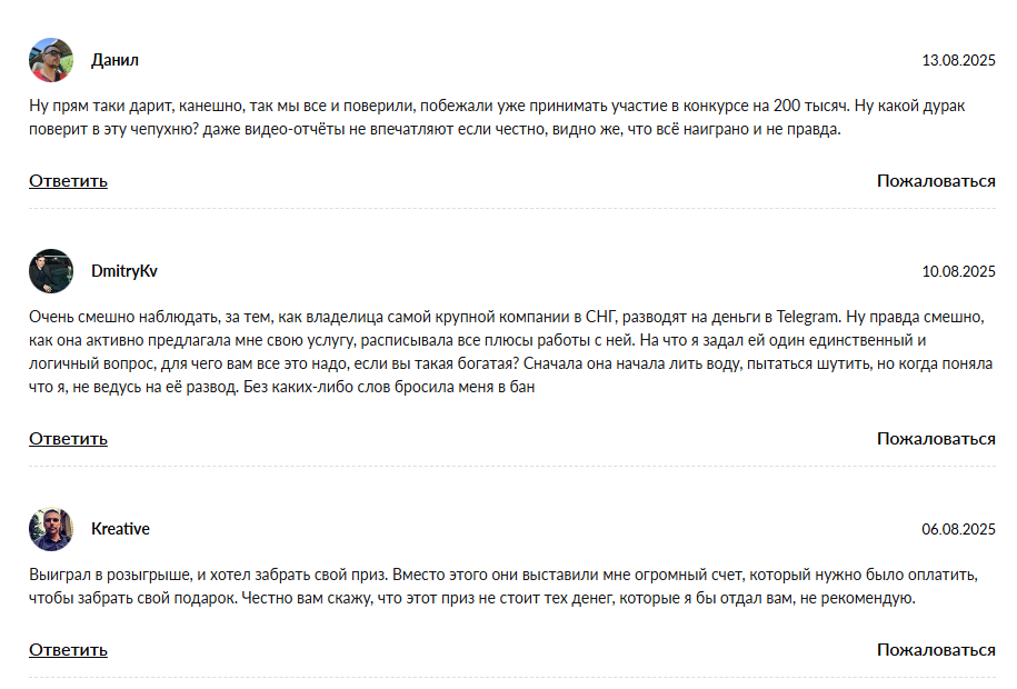 Хотя отзывов о девушке не так много, все они носят негативный характер. Валерия груба, торопит пользователя переводить деньги быстрее, а при любом сопротивлении с его стороны блокирует подписчика. Суммы потерь в подобных проектах зависят от умения быстро распознать мошенников. Некоторые пострадавшие умудряются перевести аферистке 50-60 тысяч рублей прежде чем поймут, что их обманули.