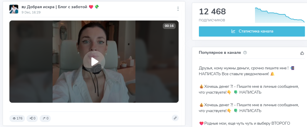 Сообщество Добрая искра Блог с заботой явно выкуплено, потому что канал был создан еще в 2015 году. Его аудитория на момент написания обзора составляет 12,5 тысячи, за последний месяц от проекта отписалось почти 8000 человек. Активности почти нет, посты просматривает около 1% пользователей, комментирование отключено. О себе Валерия заявляет, что занимается инвестициями в зарубежную недвижимость и криптовалюты. Часть дохода она раздает нуждающимся в своем Телеграмм канале. Стоит отметить, что никаких доказательств доходности девушки в проекте не предоставлено.