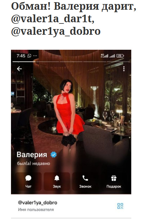 Автор канала уже не раз мелькала в негативных комментариях, она известна под именем Валерия Дарит, ссылки на ее аккаунты и сообщества обычно часто меняются, но остаются узнаваемы: valer1a dar1t, Valeriadar1t, Valer1adar1t и так далее. Условия сотрудничества выглядят так:
