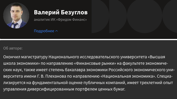 Валерий Безуглов — профессиональный финансист с экономическим образованием. Занимает должность аналитика в компании «Фридом Финанс».