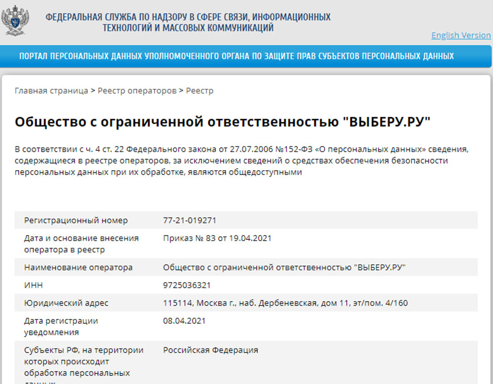 На сайте ООО «Выберу Ру» написано, что свою деятельность они начали в 2015 году. Домен создан в 2009 году и продлен до ноября 2026. Администратором на данный момент является «Выберу».Также Vbr Ru зарегистрирована в реестре федеральной службы по надзору в сфере связи, информационных технологий и массовых коммуникаций. Там платформа является обществом с ограниченной ответственностью. Также указан юридический адрес офиса. Сервис контролируется, поэтому на нем можно оставлять информацию. Vbr Ru проходит регулярные проверки на соответствие законодательным нормам, что гарантирует безопасность и конфиденциальность пользовательских данных. Это подтверждает надежность платформы как места для обмена информацией и ведения деловой активности.