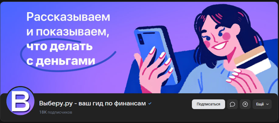 Платформа имеет свое сообщество ВКонтакте. Там рассказывается, что «Выберу» – это просто о деньгах, выгодных решениях и трендах. Создатели советуют своей аудитории, где сэкономить, как выбирать лучшее и быть в плюсе. Группа создана в 2015 году. За это время на нее подписалось 18 тысяч подписчиков. Проверка показала, что это реальные люди, которые интересуются этой тематикой. С помощью сообщества можно: