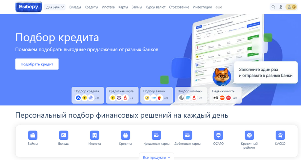 - на платформе можно рассчитать и подобрать финансовый продукт, изучить отзывы, плюсы и минусы, условия оформления, а также оставить заявку прямо на сайте;