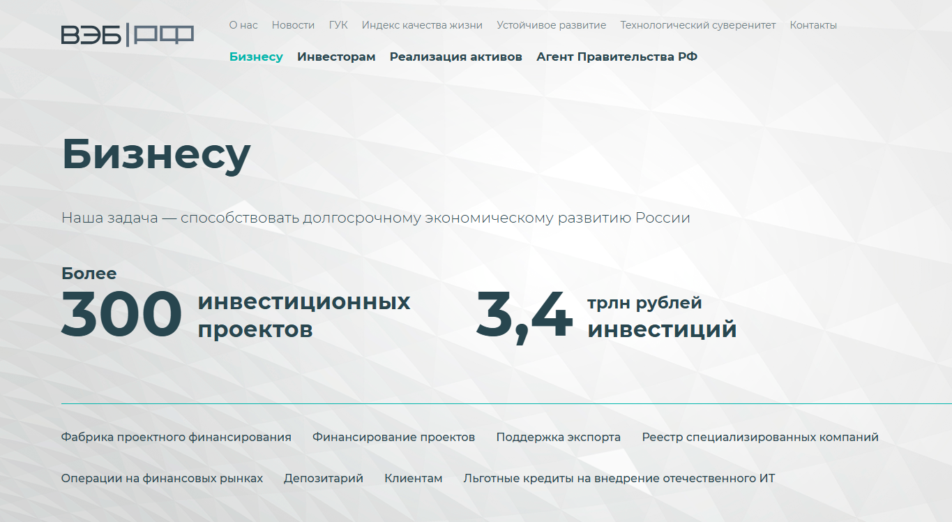 Государственная корпорация развития ВЭБ РФ — место, где деньги государства и долгие горизонты инвестиций встречаются с экономикой.