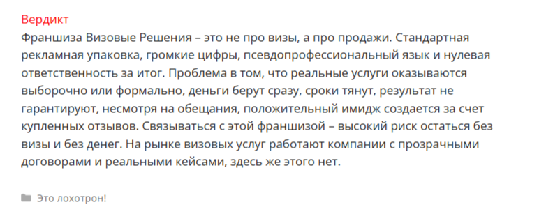 Негативных отзывов о платформе «Визовые решения» наша команда в интернете не нашла. Мы обнаружили в сети лишь предостережения других экспертов. В них упоминается слово лохотрон и размещены рекомендации обращаться за помощью к проверенным экспертам.