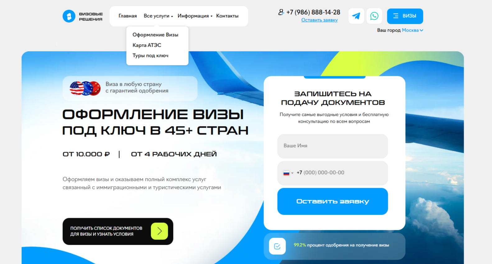 Сайт vizovye resheniya ru предлагает жителям РФ франшизу ООО «Визовые Решения» (ОГРН 1237700793087, ИНН 9717148053). Упомянутая организация около 2 лет занимается в Москве деятельностью туристических агентств. Аналогичную работу проводит и франчайзи под руководством Абдурашитова Руслана Шамильевича. Платформа на сайте vizovye resheniya ru предлагает целевой аудитории визы в 45+ стран мира с гарантией одобрения 99,2%, карты АТЭС, туры под ключ. Для получения разрешения на въезд в чужое государство пользователю достаточно:
