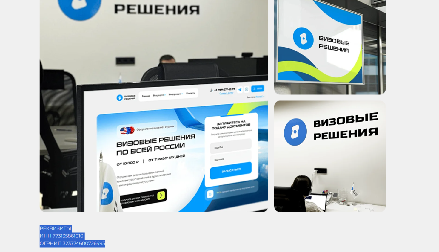 Веб-сайт организации имеет классический для подобных проектов дизайн: красивые обещания быстрого оформления визы с беспрецедентной гарантией одобрения 99,2%, яркие картинки зарубежных государств. На главной странице портала можно обнаружить историю надежной компании, которая занимается деятельностью турагентств 5+ лет. Руководит компанией ИП Абдурашитов Руслан Шамильевич (ОГРНИП 323774600726493, ИНН 773135861010).