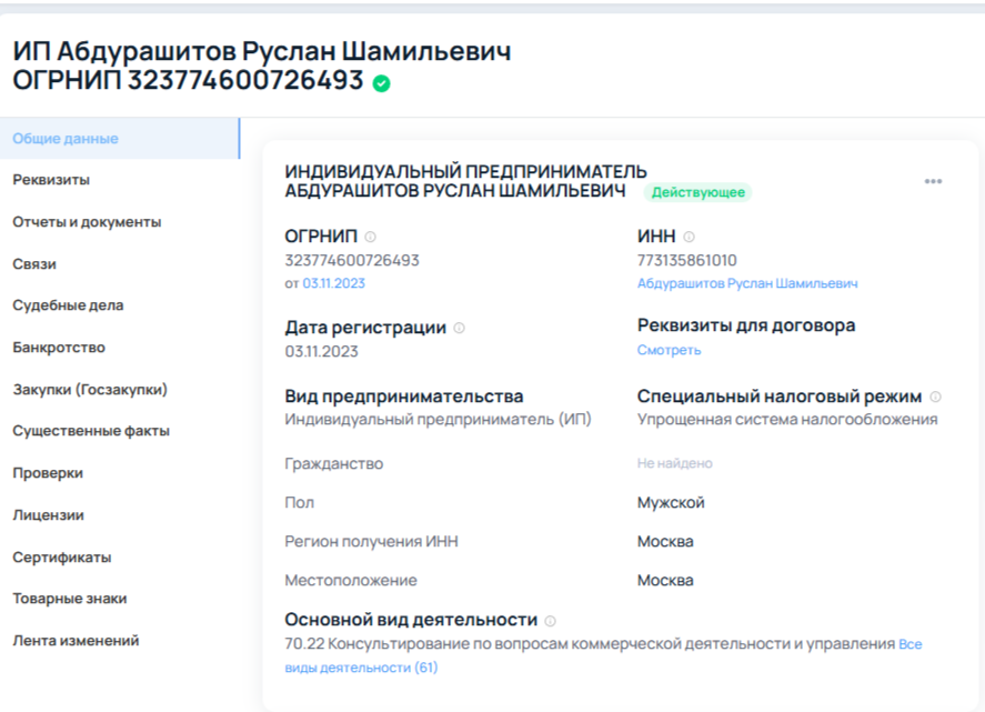 На сайте vizovye resheniya ru размещена франшиза «Визовые Решения» под руководством Абдурашитова Руслана Шамильевича. Дата регистрации ИП – 03 ноября 2023 года. ОКВЭД данного предпринимателя – консультирование по вопросом коммерчиской деятельности. На основании перечисленных фактов можно сделать следующие выводы. Проект на веб-сайте vizovye resheniya ru работает нелегально. Информация о стаже работы в 5+ лет является ложной.