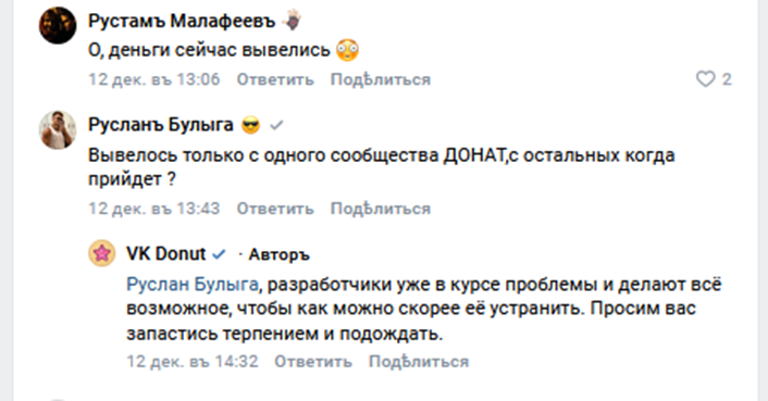 В группе сервиса комментирование открыто, тут ведется обсуждение работы площадки, других технических вопросов. Среди них – проблемы с выводом средств, которые наблюдались в середине декабря. Как понятно из отзывов в VK Donut, систему наладили, выплаты провели. То есть технические специалисты работают, сбои устраняются.