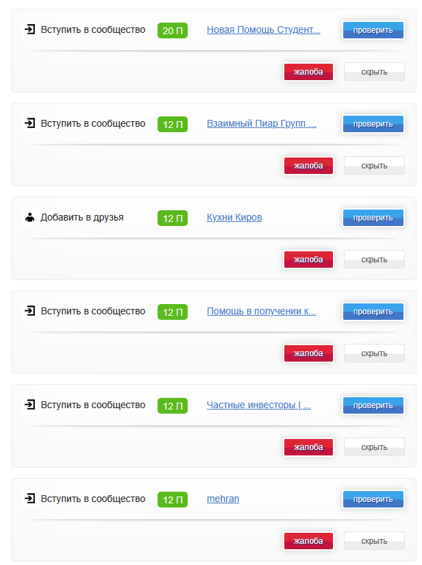 Пользователи после создания аккаунта на бирже могут выполнять задания по вступлению в сообщества, добавления в друзья и т.д.