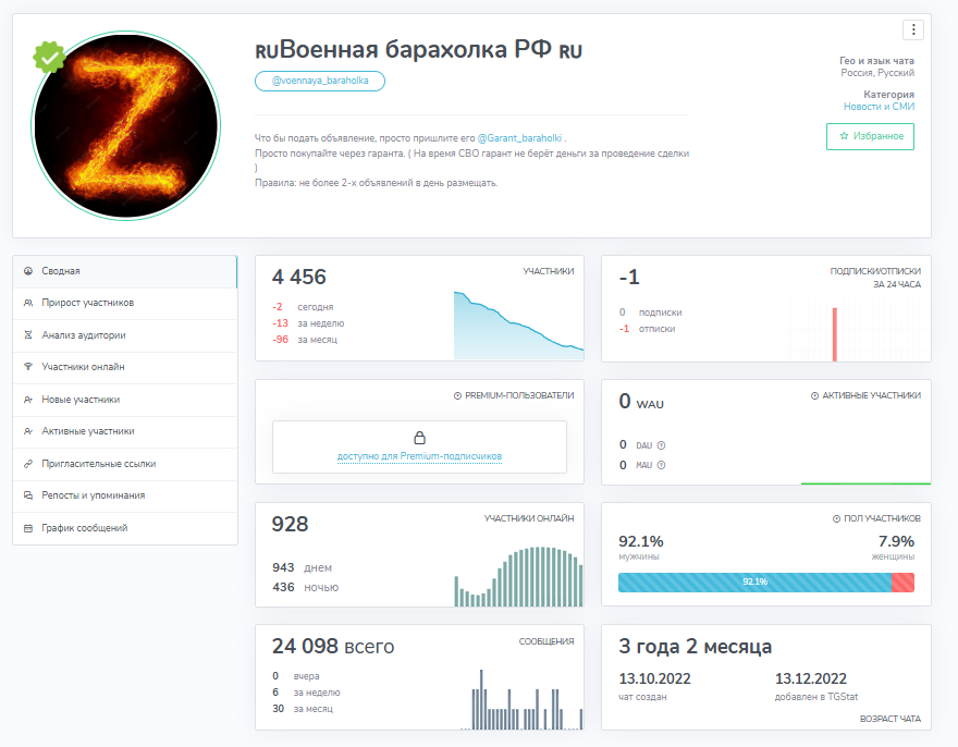 «Военная барахолка» — телеграм-чат по продаже амуниции для военных действий. Канал не выступает сам как поставщик и продавец, а всего лишь предоставляет площадку для пользователей. Канал привлекает низкой ценой. Большая часть товаров здесь уже были в употреблении. Низкой стоимостью обычно заманивают мошенники, а во время СВО появилось много тех, кто наживается на ситуации, так что проект нужно проверить.
