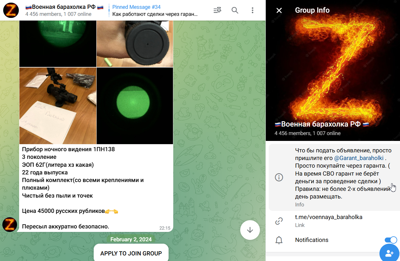 Телеграм-канал «Военная Барахолка РФ» существует уже больше трех лет. На сегодня в нем 4,5 тысячи пользователей. Купить здесь можно любую амуницию, от обычной формы до тепловизоров, дронов и даже часов с уже установленными картами. Как известно, все это стоит недешево. В данном канале амуницию можно приобрести дешевле, чем в магазинах. Часть товаров уже были в употреблении, но есть и новые предложения. Продавцами выступают обычные пользователи. Чтобы избежать потерь от мошенников канал предлагает услуги гаранта, через которого и будет проводиться оплата. Часто здесь публикуют объявления и магазины, когда у них распродажи или закрытие.
