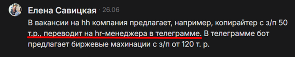 - все общение происходит только через ТГ аккаунт, оценить наличие и возможности предлагаемых вакансий нельзя;
