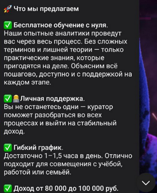 При этом соискателю сразу обещают высокий доход – от 80 тысяч рублей, что для такой должности и занятости всего в пару часов в день выглядит странным. Далее начинаются странности. Чтобы начать работать, следует пройти платное обучение у куратора. Обещают только практику, пошаговые инструкции и поддержку во время работы. Занятость – 1-1,5 часа в день.Обучение требуется оплатить сразу, но особенности оплаты раскрываются только при общении с куратором. Обычно – это переводы на карту третьего лица. При вопросах о заключении договора или гарантиях общение резко прерывается.