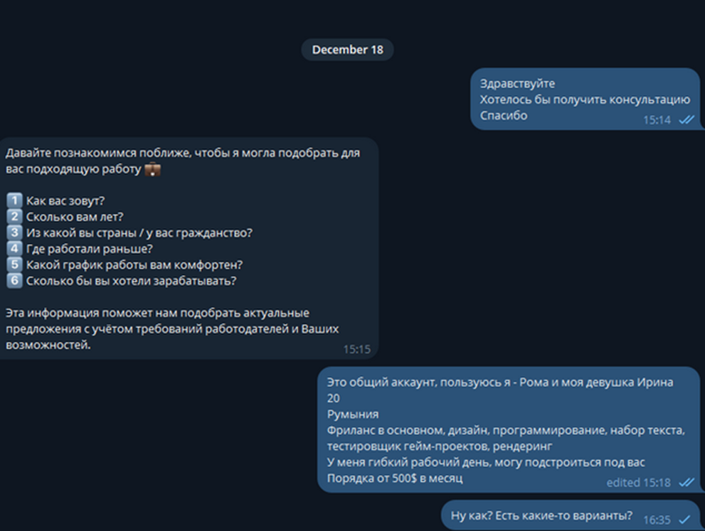 Волкова предлагает вакансии по удаленной работе преимущественно для граждан РФ. При первом общении нужно заполнить анкету и указать личные данные, включая возраст, страну проживания, пожелания по графику и зарплате. Далее Мирослава обещает подобрать вакансии, которые больше всего соответствуют указанным данным. Никаких вопросов о компетенции или образовании не возникает.
