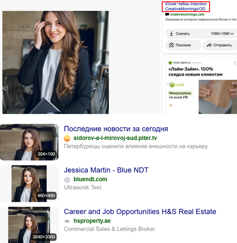 Проверка по фамилии ничего не дала. Такой специалист нигде не указан, на ее имя не открыто ИП, о государственной регистрации ничего не известно. Но зато удалось найти фото, которое использует Телеграм канал Мирослава Волкова. Это обычное стоковое изображение, которое довольно часто фигурирует на зарубежных ресурсах. То есть уже имеются основания подозревать Мирославу в мошенничестве.