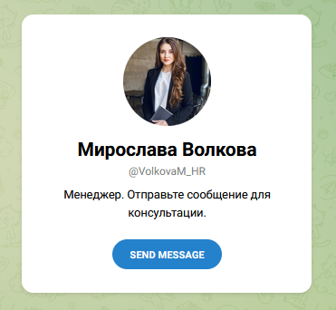 Мирослава Волкова – менеджер HR, предлагающий вакансии по удаленной работе. Никаких деталей о своей деятельности не разглашает. Также неизвестно, действует ли специалист самостоятельно или от имени какой-либо компании. По всем вопросам предлагает писать на персональный аккаунт в ТГ VolkovaM HR.