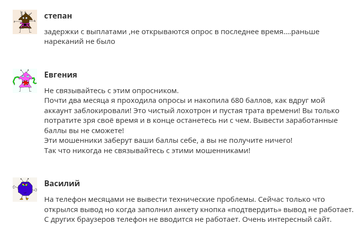 Но, у В Опрос отзывы есть и негативные — в них люди пишут, что минималка для вывода в 1 000 рублей слишком высокая. А еще часто наблюдаются проблемы с выводами — платежи зависают или вообще не приходят. А саппорт молчит.