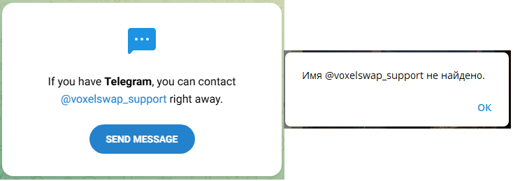• Неработающая техподдержка: телеграм-аккаунт @ Voxelswap Support удален или заблокирован;