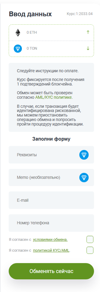 Совершать обменные операции можно без регистрации, эта возможность на платформе вовсе отсутствует. Заявку на обмен сразу предлагают заполнить на главной странице. В ней нужно указать сумму, реквизиты, e-mail и номер телефона. В ходе тестирования мы обнаружили серьезный системный сбой: платформа не позволяет изменить количество криптовалюты в заявке. Данная неисправность не позволяет использовать базовый функционал и делает сервис непригодным для полноценного использования.