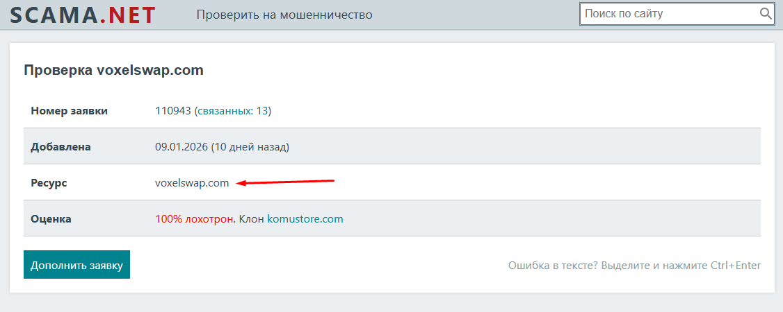 Судя по отзывам пострадавших, сайт Voxelswap Com привлекал людей заявлениями о выгодных курсах. Однако после отправки монет транзакция просто зависала без какого-либо результата. Связаться с техподдержкой было невозможно. Дополняет картину и тот факт, что портал ScamaNet обозначил сервис как «100% лохотрон».