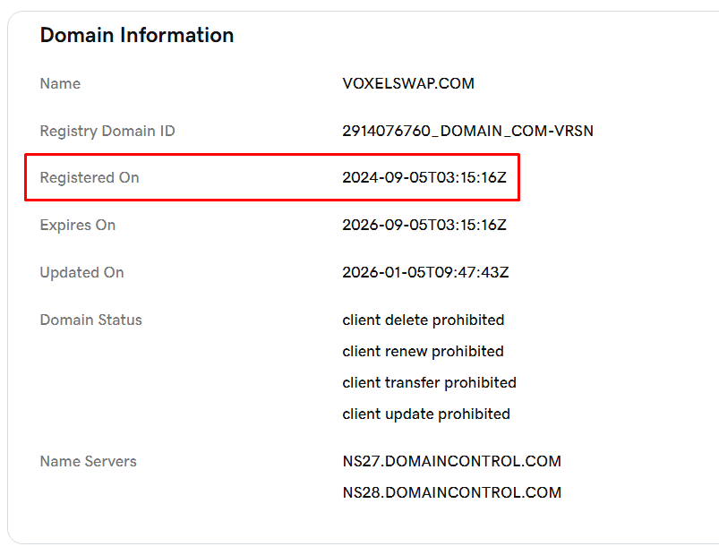 Проверка по WHOIS домена Voxelswap Com показала, что он был зарегистрирован в сентябре 2024 года, то есть проекту на момент написания обзора уже больше года. Однако за это время он так и не прошел независимый аудит. Платформа отсутствует в листинге BestChange и на других аналогичных порталах.