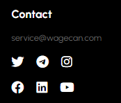 На главной странице размещены ссылки на профили компании в социальных комьюнити, включая имя аккаунта Wagecan team, а также почтовый адрес организации Service wagecan com.