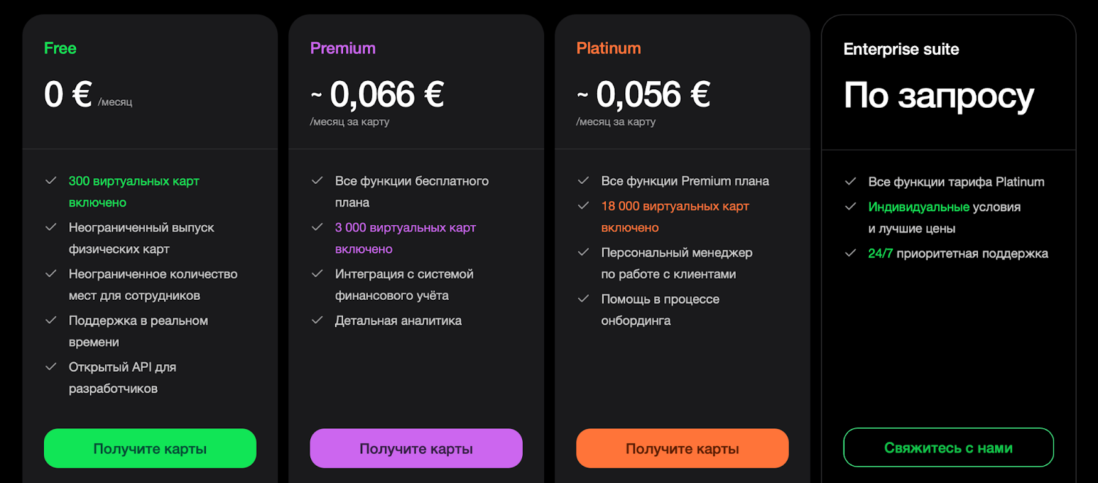 • платинум. Цена – 0,056 евро за карту в месяц. Число виртуальных карт увеличено до 18 тысяч. Добавляется персональный менеджер, а также помощь в процессе онбординга;