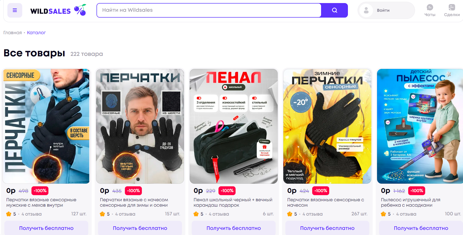 На первый взгляд сайт выглядит как сервис для маркетплейсов. Интерфейс современный, каталог наполнен товарами, многие позиции показаны с кэшбэком 100%, то есть формально за 0 рублей, а рядом указаны рыночные цены на Wildberries, что создает эффект выгоды.