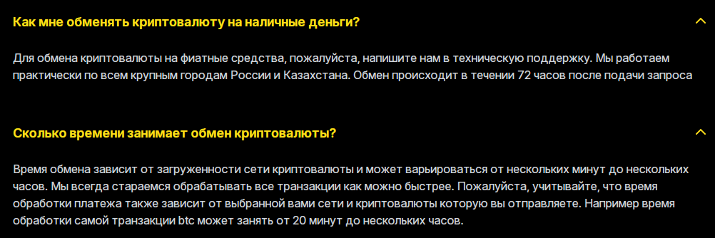 Время обмена зависит от загруженности сети криптовалюты. Оно может варьироваться от нескольких минут до нескольких часов. О комиссиях и сборах речи нет. Непрозрачность в этом плане является минусом, так как менеджеры могу приписать скрытые суммы.