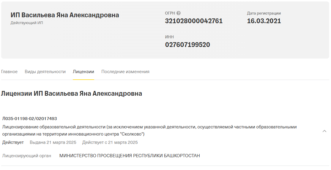 В процессе изучения данных о преподаватели нами выявлены следующие детали. ИП Яны Васильевой зарегистрировано 16 марта 2021 года в Башкортостане. Эксперт в сфере бухгалтерии ведет легальную преподавательскую деятельность на основании ОКВЭД 69.20.3 и лицензии № Л035-01198-02/02017493 от 21 марта 2025 года.