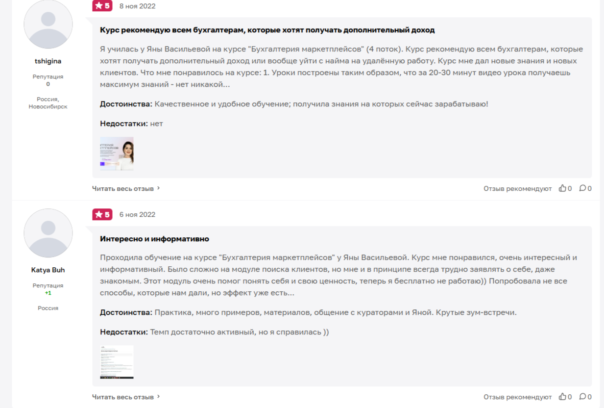 За свою преподавательскую карьеру эксперт в сфере бухгалтерии получила некоторое число позитивных комментариев. Правда достаточно давно. В положительных отзывах пользователи упоминают качественное и удобное обучение, полезные знания и крутые зум-встречи.