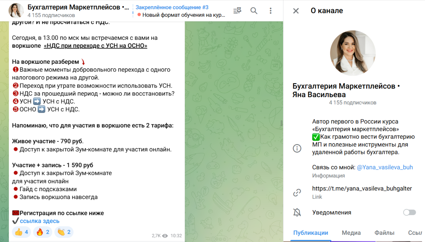 Свои бухгалтерские курсы до недавнего времени Яна Васильева (Yana vasileva buh) продвигала в телеграм-канале «Бухгалтерия маркетплейсов Яна Васильева». Проект появился в мессенджере 26 февраля 2022 года. На сегодняшний день телеграм-канал имеет 4 000+ подписчиков. Здесь можно найти публикации о курсах, мастер-классах, воркшопах преподавателя. Вовлеченность подписчиков составляет 1,81%. Тонкий намек на использование ботов. Последняя публикация канала датирована 1 октября 2025 года. По некоторым данным основательница канала ушла в декрет.