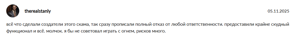 Вызывает негатив также то, что авторы не берут на себя никакой ответственности. Бота называют скам-проектом.