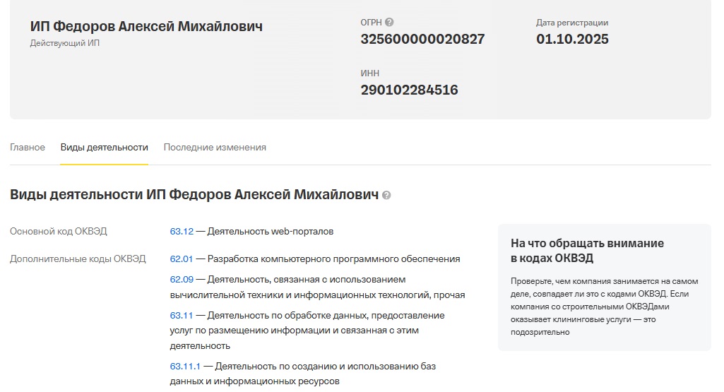 - Как ИП Фёдоров зарегистрировался только 1 октября 2025 года. Получается, 8 лет работа велась нелегально