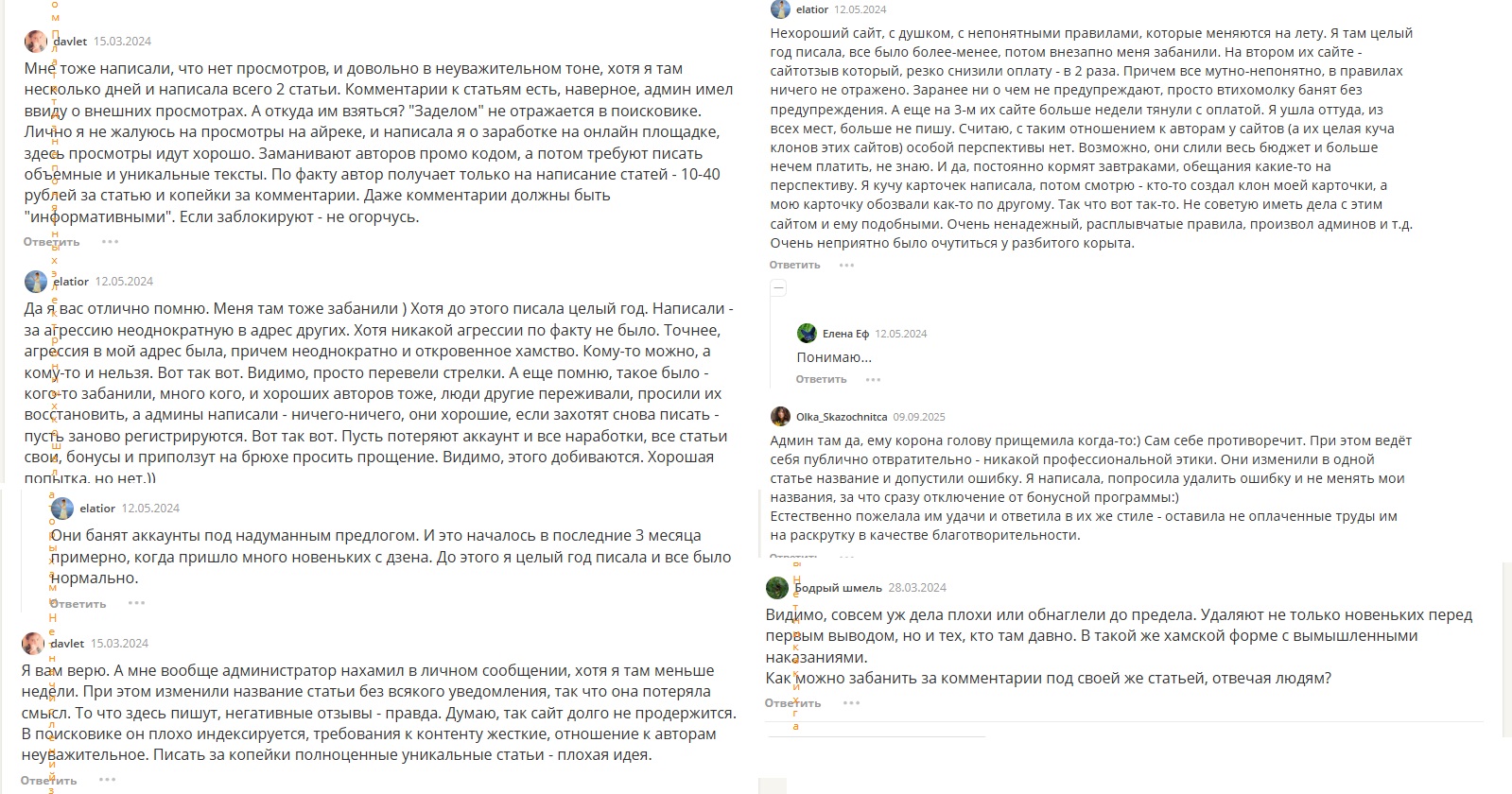 На независимых площадках отзывы диаметрально противоположные. Авторы уверяют, что новичков заманивают на проект обещаниями высоких заработков: первые статьи оплачивают, а дальше начинаются проблемы с модерацией. Контенту дают очень низкие оценки и якобы его не принимают — доработка не предусмотрена. На самом деле статьи размещают на сайтах, а аккаунт исполнителя блокируют. Таким образом, владельцы воруют у авторов по 5–10 текстов. Кроме того, их личные аккаунты продолжают использовать или продают. Также клиенты отмечают крайне хамское отношение админов.