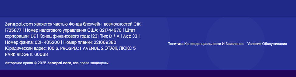 Компания «Зенепал Ком» стремится выглядеть в глазах пользователей с положительной стороны. Поэтому внизу сайта криптовалютного кошелька указан юридический адрес: якобы организация зарегистрирована в США. Также говорится об авторских правах на сайт. Там же находятся условия обслуживания клиентов.