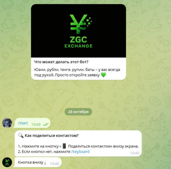 Услугами обменника Zgc Exchange могут воспользоваться все желающие. Для этого не нужно проходить регистрацию. Достаточно подтвердить свой номер телефона в Телеграме. После подтверждения номера бот позволяет клиенту осуществлять обмен валют и B2B. Для осуществления обменных операций в мессенджере необходимо следовать инструкции.