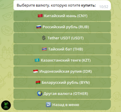 Основная деятельность сервиса в Телеграме – транзакции с фиатной валютой и криптовалютой. В обменном пункте посетители могут совершить обмен CNY, THB, KZT, RUB, IDR, BYN. Платформа Zgc Exchange Bot осуществляет обменные операции только с одной криптовалютой USDT. Для совершения финансовых транзакций посетителям сервиса доступны: